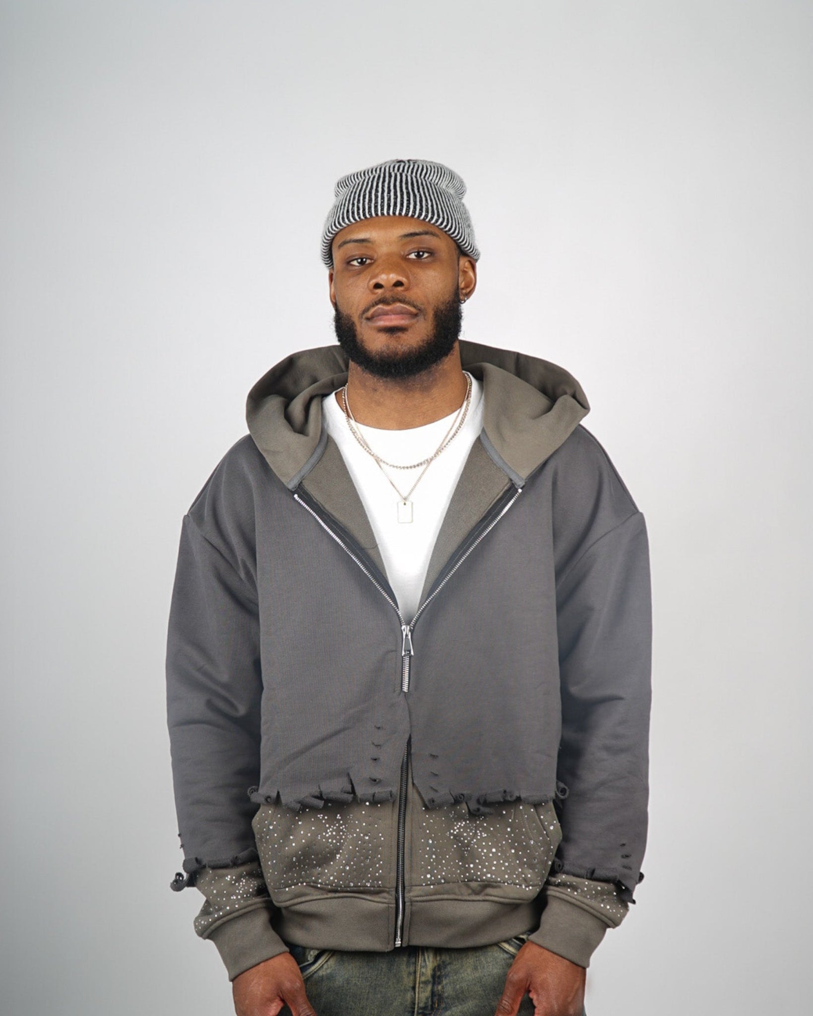 The Celestial zip-up hoodie is crafted from premium 100% cotton, featuring double-layering throughout the piece. There are 2 distinct hoods and 2 separate pairs of front pockets, adding versatility. The Sixteen Octobers logo is embroidered on the back, along with the slogan "For the love of God be a star" on the 2 hoods. The distressed top layer is another unique feature, which reveals the shining rhinestones adhered to the bottom layer. The rhinestones artfully form "constellations" of the Sixteen Octobers logo throughout the bodice.